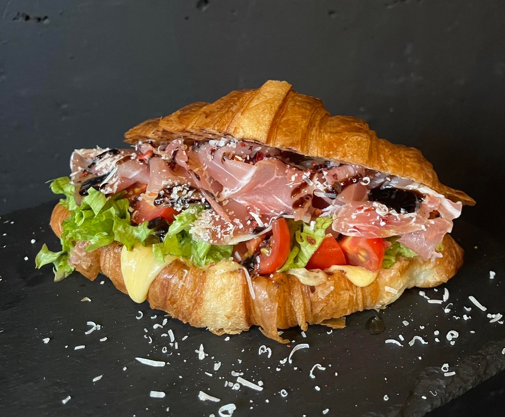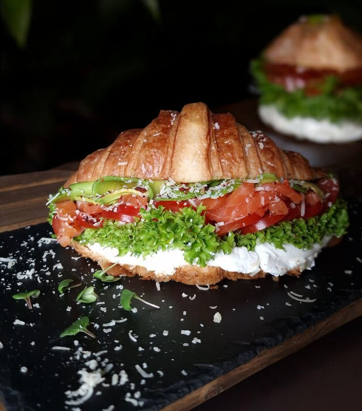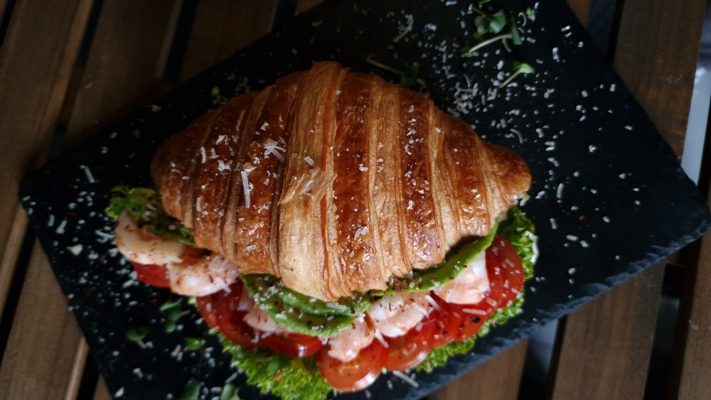 Великий круасан з креветкою , чізом , зеленим салатом , помідорами та авокадо
