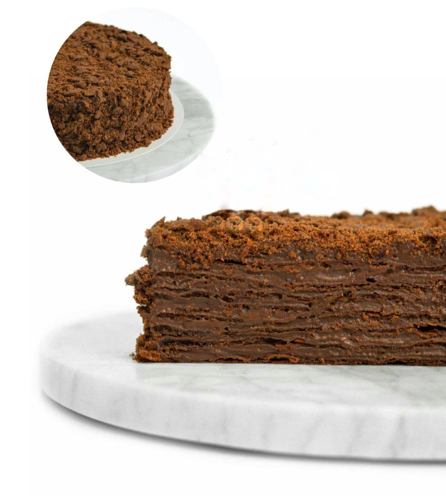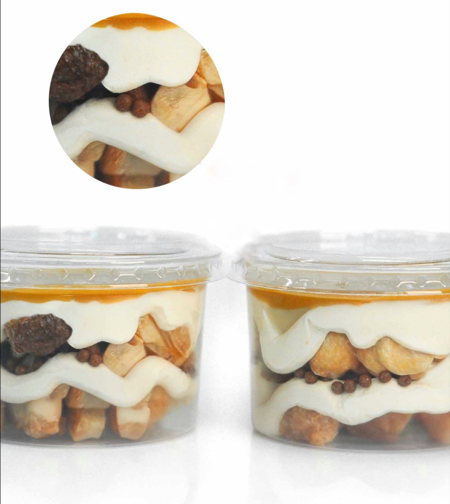 Шматочки листкового тіста у молочній пропитці, хрусткі кульки, ніжний крем та глазур на основі вареного згущеного молока.