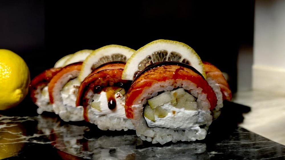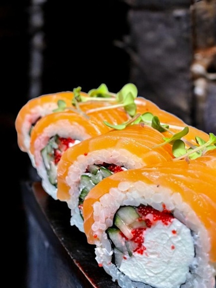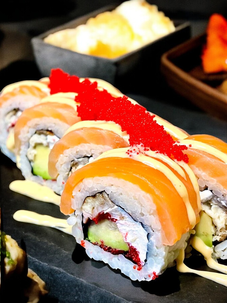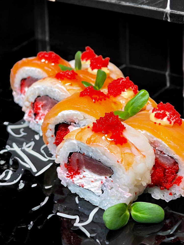 Склад: Рол, в якому багато лосося та креветки , з авокадо , чізом , ікоркою масаго та соусом від шефа