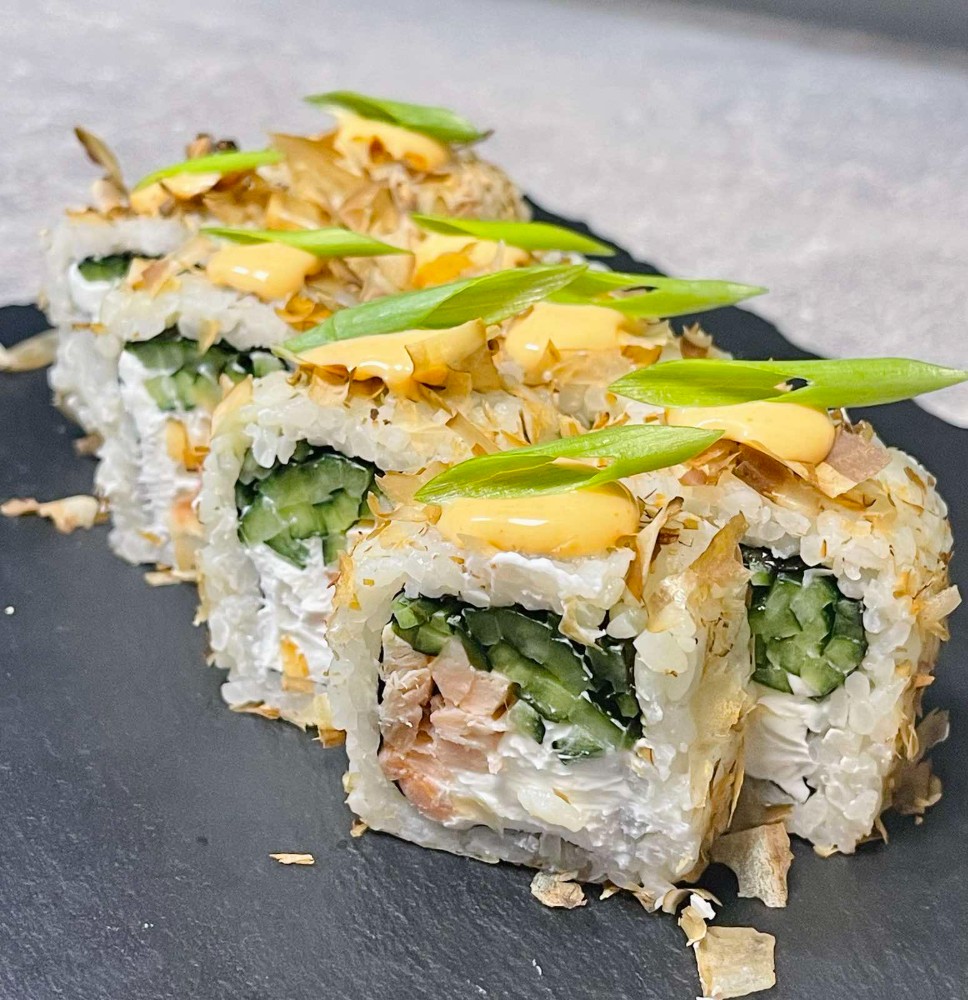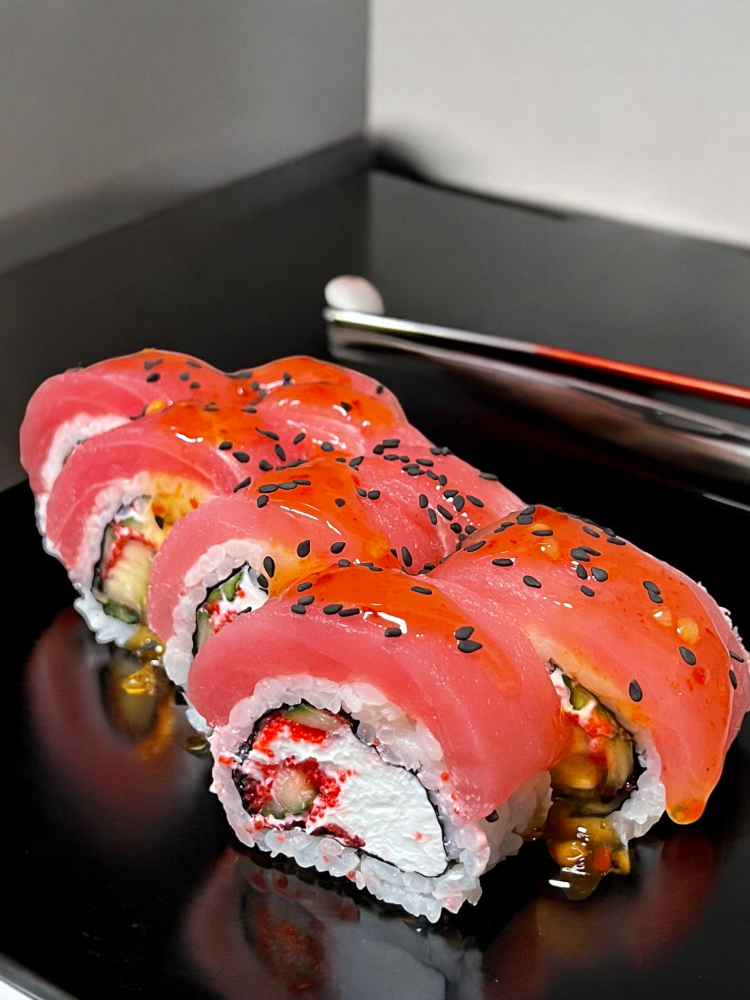 Склад: Рол в стружкі тунця з крем-чі́зом , свіжим огірком, смаженим лососем та фірмовим соусом з додаванням зеленої цибулі