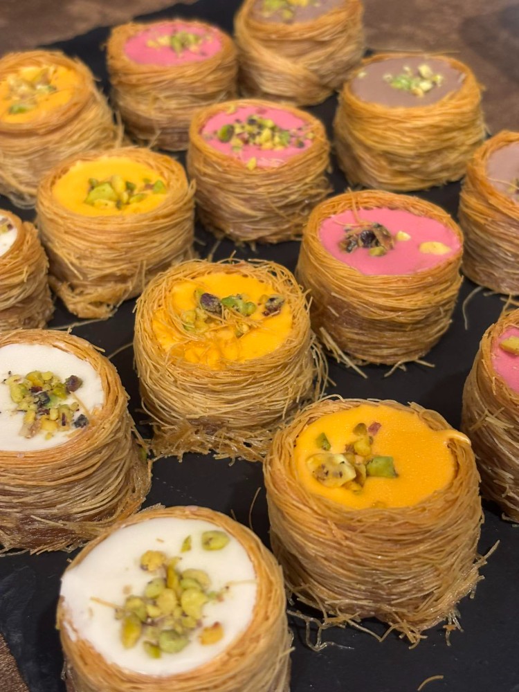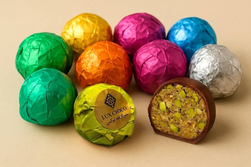 Склад: молочний шоколад, начинка з різноманітних горіхів (фісташка, мигдаль, кеш'ю, макадамія, фундук) і часто катаіфі (тісто phyllo), карамель або сухофрукти