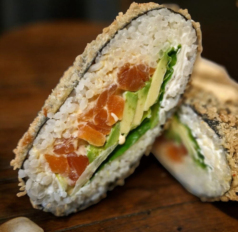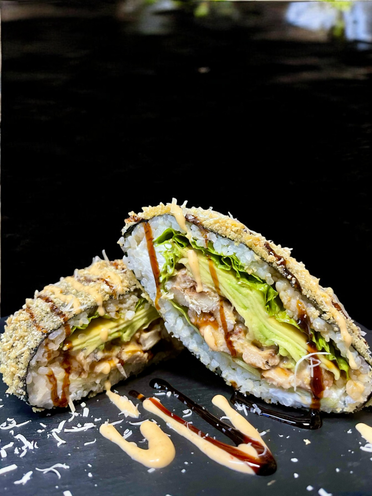 Соковитий великий суші-бургер з лососем , авокадо , свіжим огірком та роменом . Багато вершкового чіза , фирмового соуса в хрусткій скоринці панко