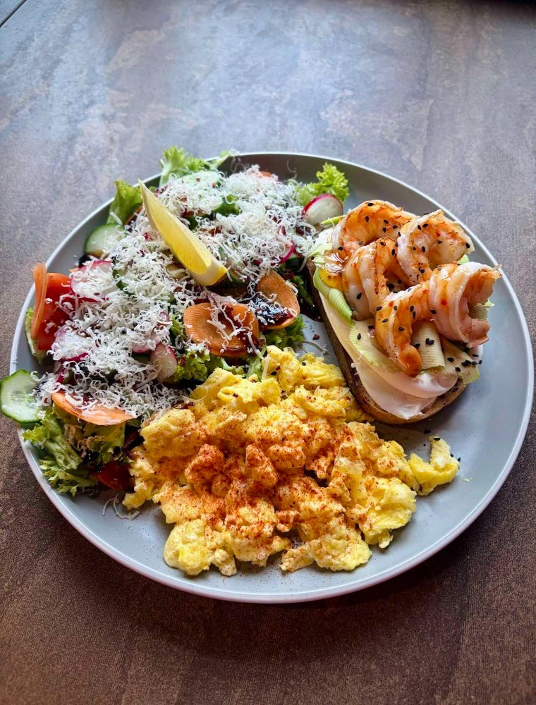 Хелсі-боул зі скрамблом , креветкою , міксом зеленого салату та сезоними овочами , авокадо та гріночками