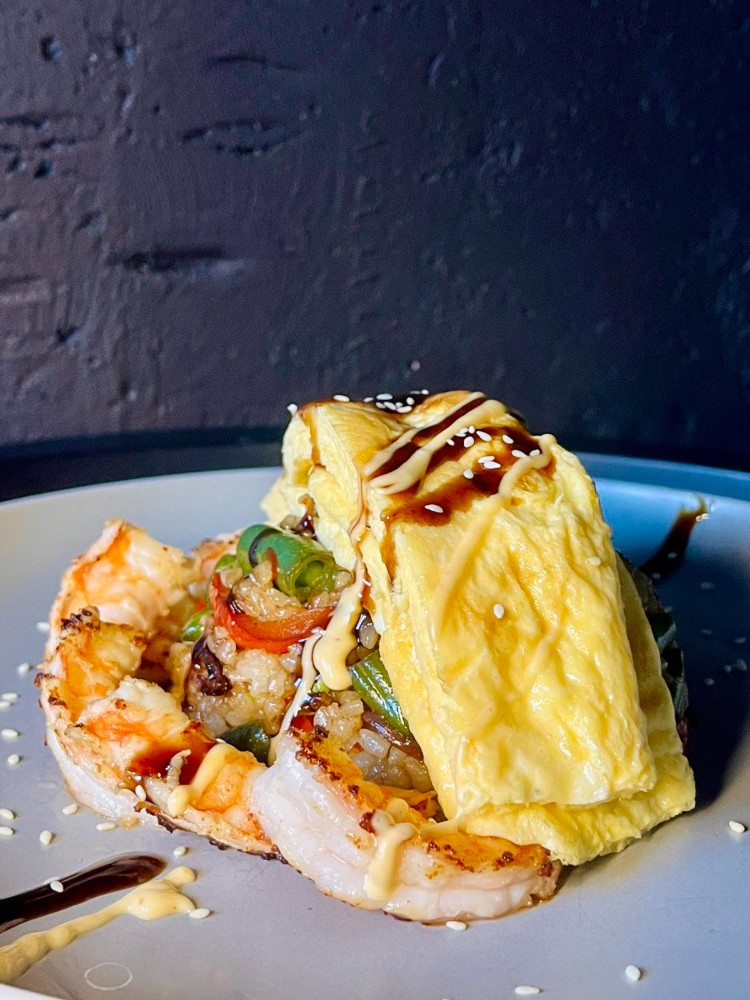 Опис: смажений рис з овочами (спаржова квасоля, солодкий перець, цибуля, часник) з соусом Теріякі та королівськими креветками. Подача з пухким омлетом