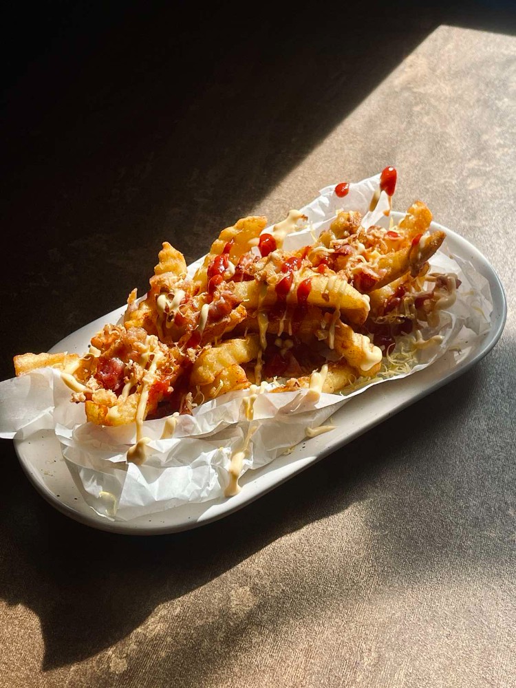 Опис: хвиляста картопля фрі з беконом, копченою паприкою, сиром Чедер, фірмовим і томатним соусом, та луком Кріспі