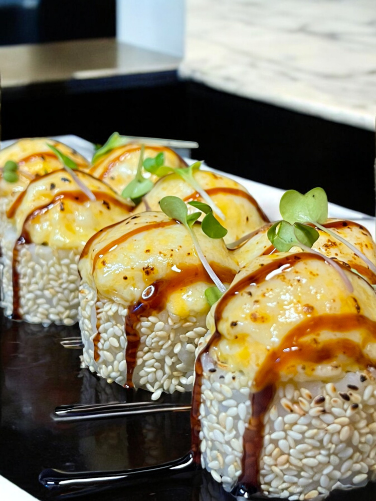 Великий запечений рол з копченим вугрем , авокадо та чізом . Запечена шапочка з 4х сирів (чедер, моцарела та радомер) прикрашена унагі соусом та пармезаном