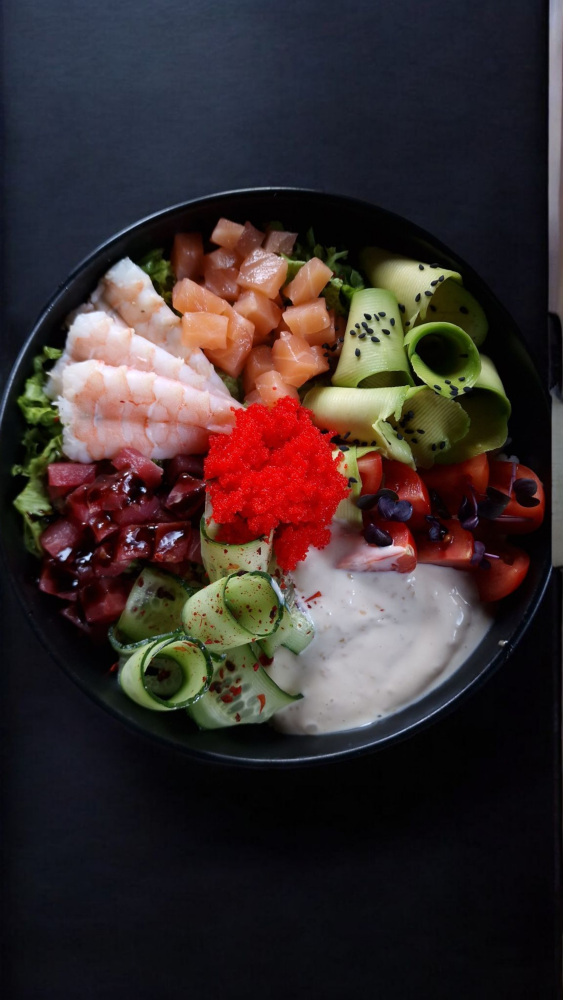 В цьому поке зібрано все що ви любите- креветка, лосось, тунець , помідори, огірок та авокадо