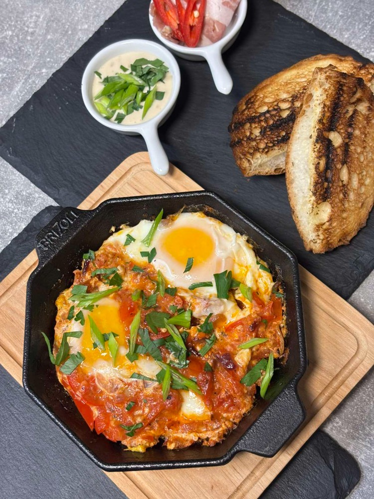 Популярна страва Близького Сходу та Північної Африки, що складається з яєць, приготованих у густому соусі з помідорів, цибулі, перцю та ароматних спецій (зіра, паприка)