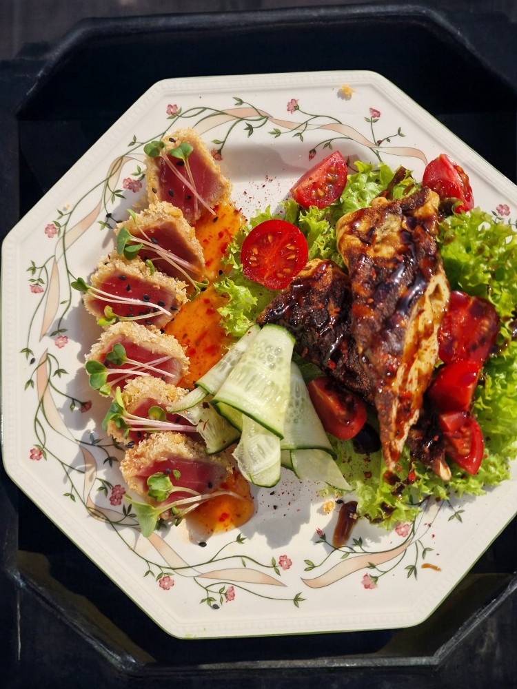 Боул з атлантичним рожевим тунцем в паніровці , японським омлетом та свіжим салатом з сезоних овочів