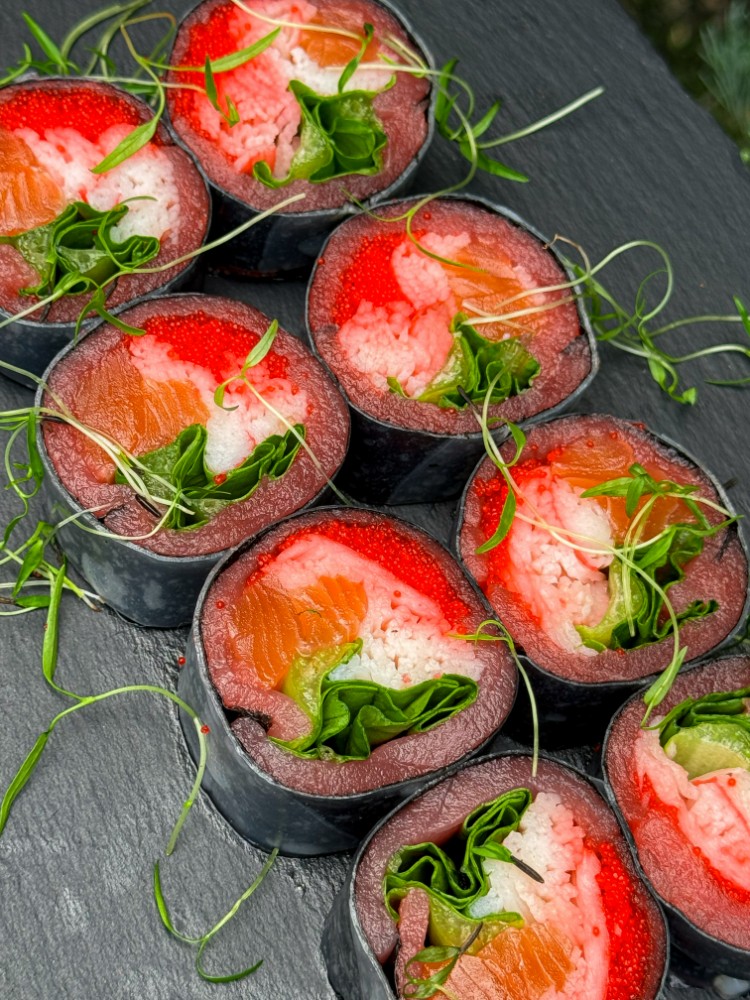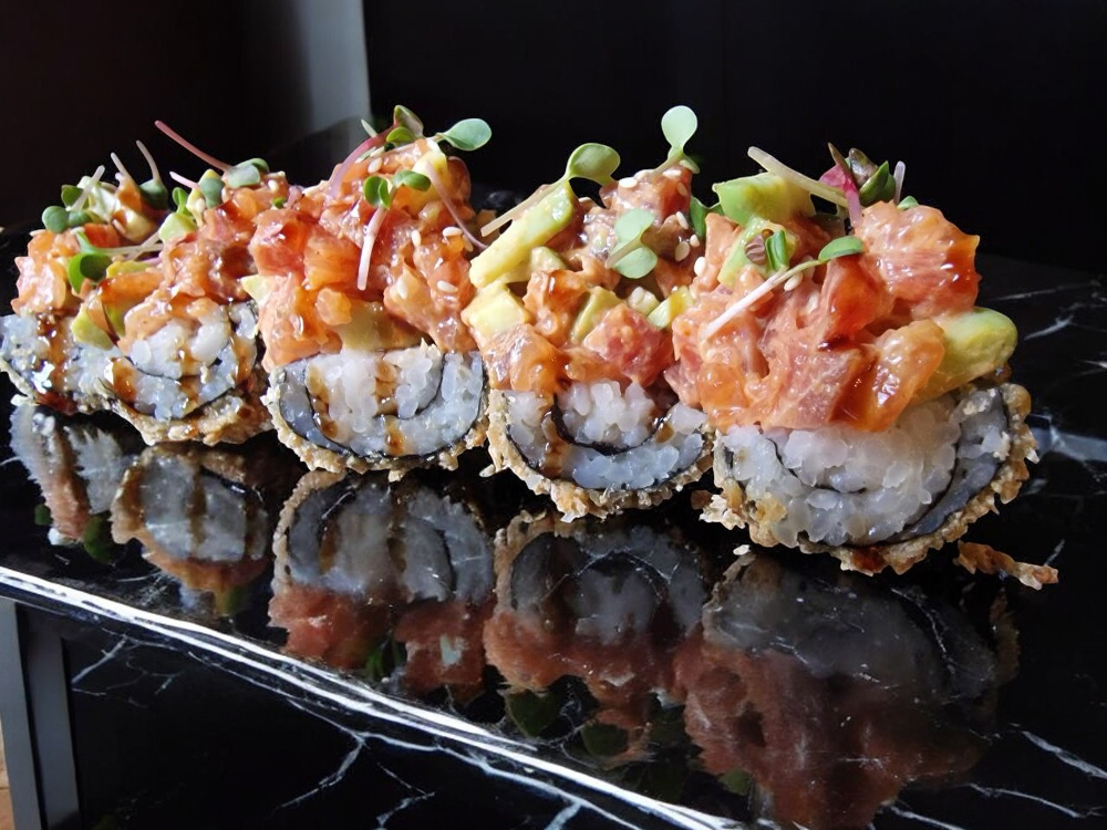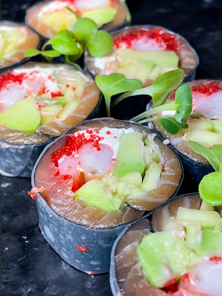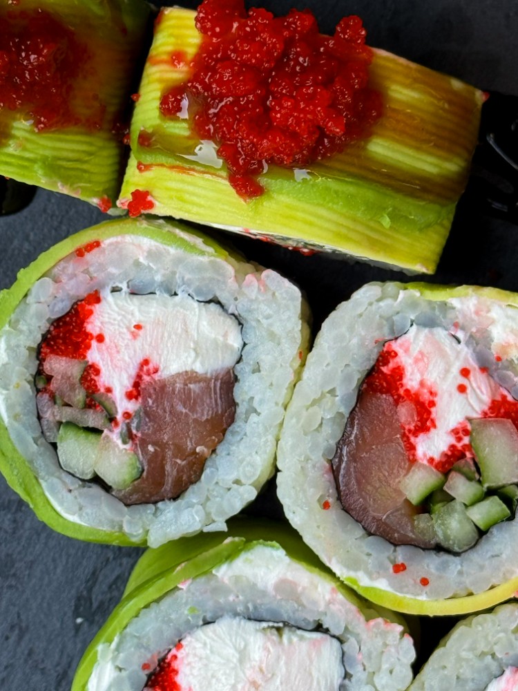 Рол з тартаром із лосося, тунця, фірмового соуса, авокадо ті мікрогріном