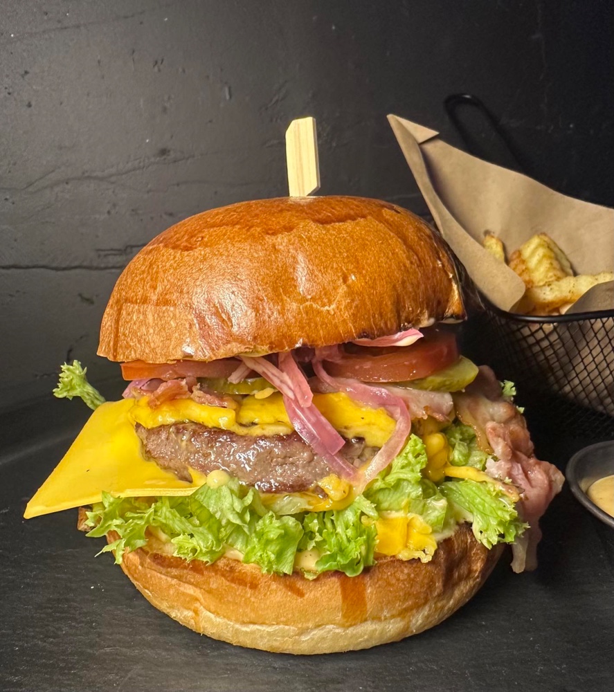 Склад: булочка бріош, котлета, картопля фрі, помидор чері, огірок маринований, цибуля червона маринована, сир чедер, бекон, салат зелений, соус фірмовий