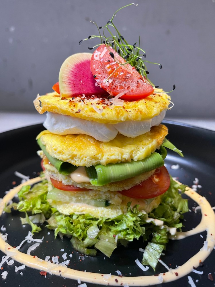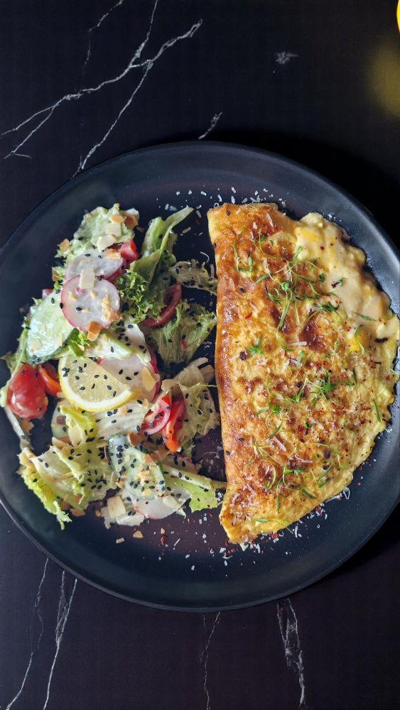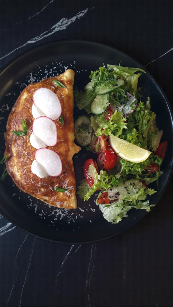 Омлет , багато сиру( моцарела , чедер та радомер . Подаємо з салатом