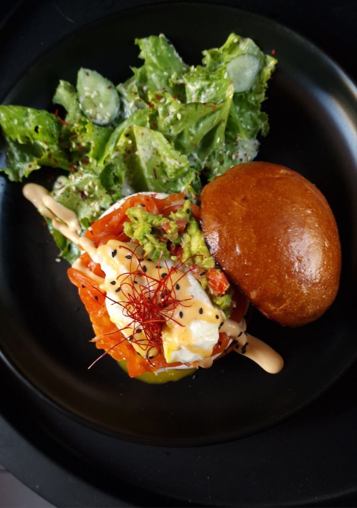 Тост з мятим авокадо , норвезьким слабосолоним лососем , яйцем-пашот під фірмовим соусом на булочці бріошь та свіжим салатом