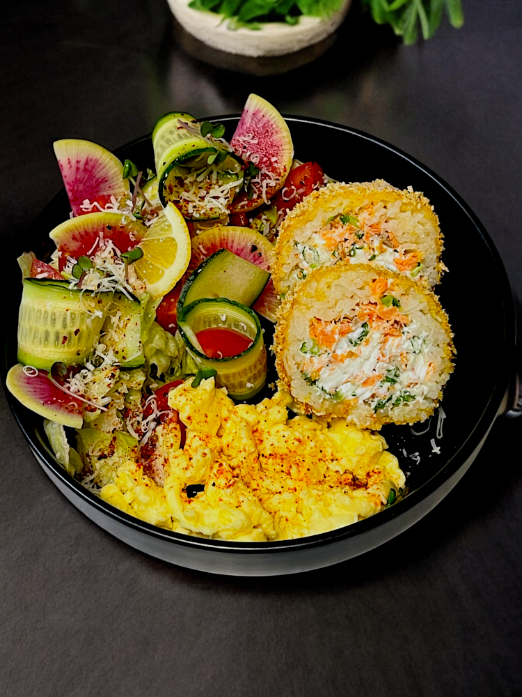 Рисові кульки аранчіні з маринованим лососем та чізом у фритюрі. Подаємо зі скрамблом та свіжим салатом