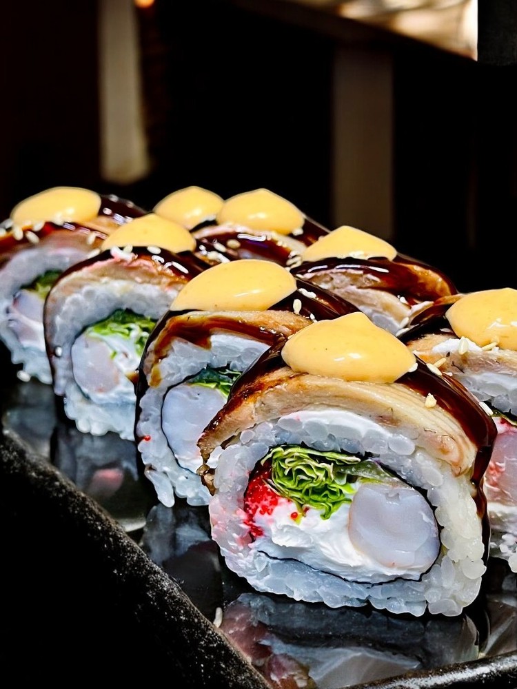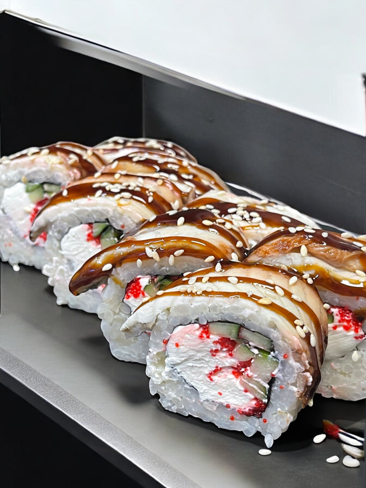 Склад: Багато вугра , креветка королівська , салам ромен, ікорка масаго, чіз,соус унігі та соус фірмовий