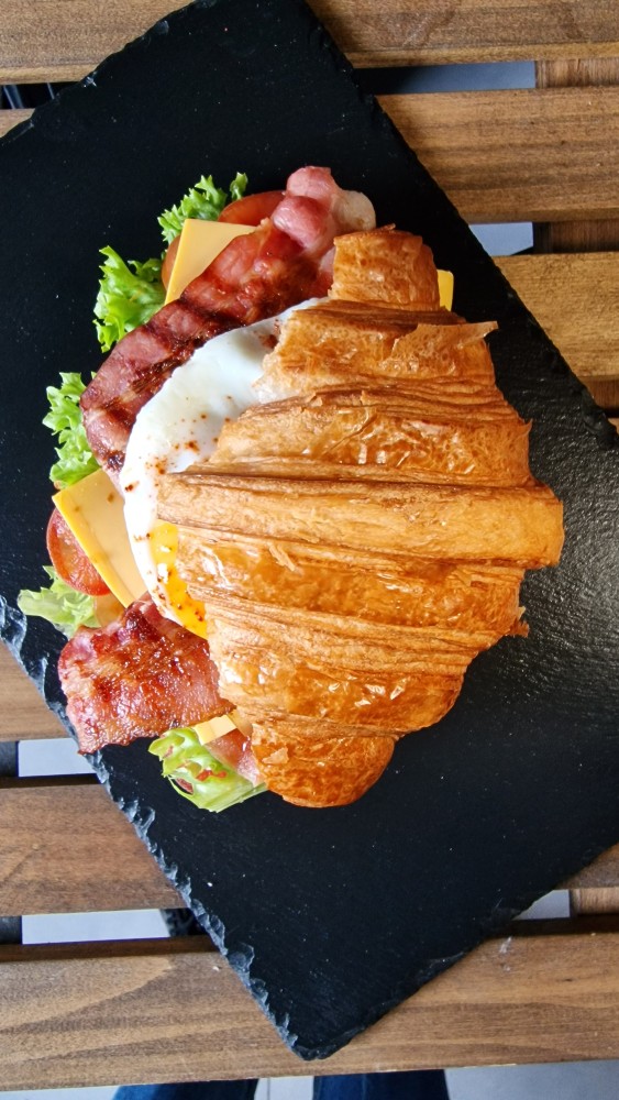 Великий круасан зі смаженим беконом , яєшнею , чедером , зеленим салатом , помідорами та соусом барбекю