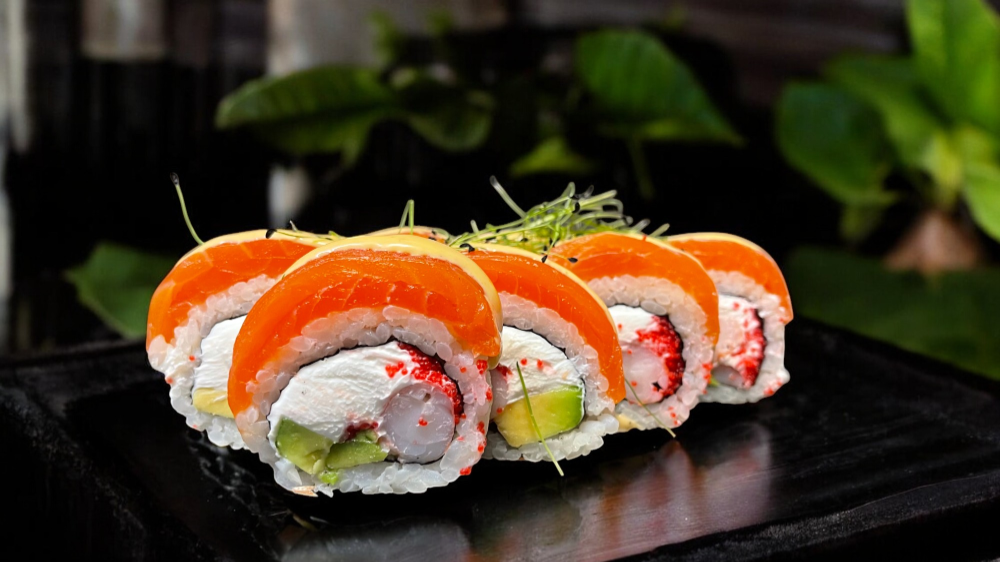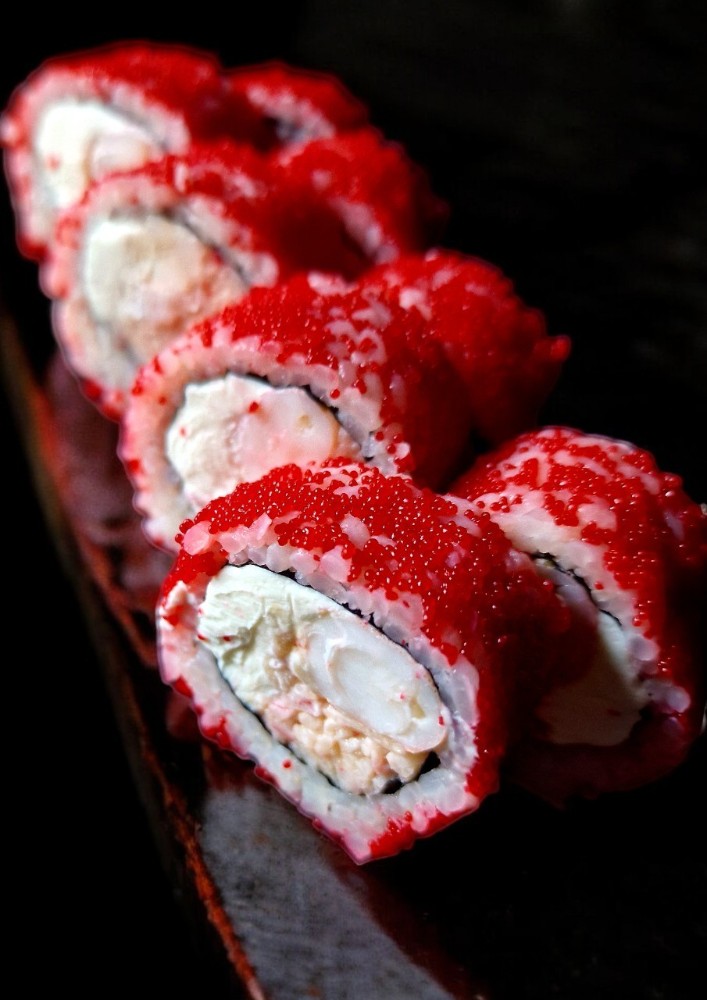 Великий рол з креветкою, лососем та тунцем, вершковим чізом та ікрою масаго