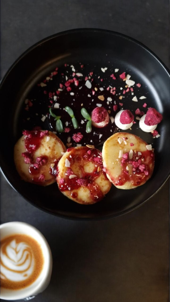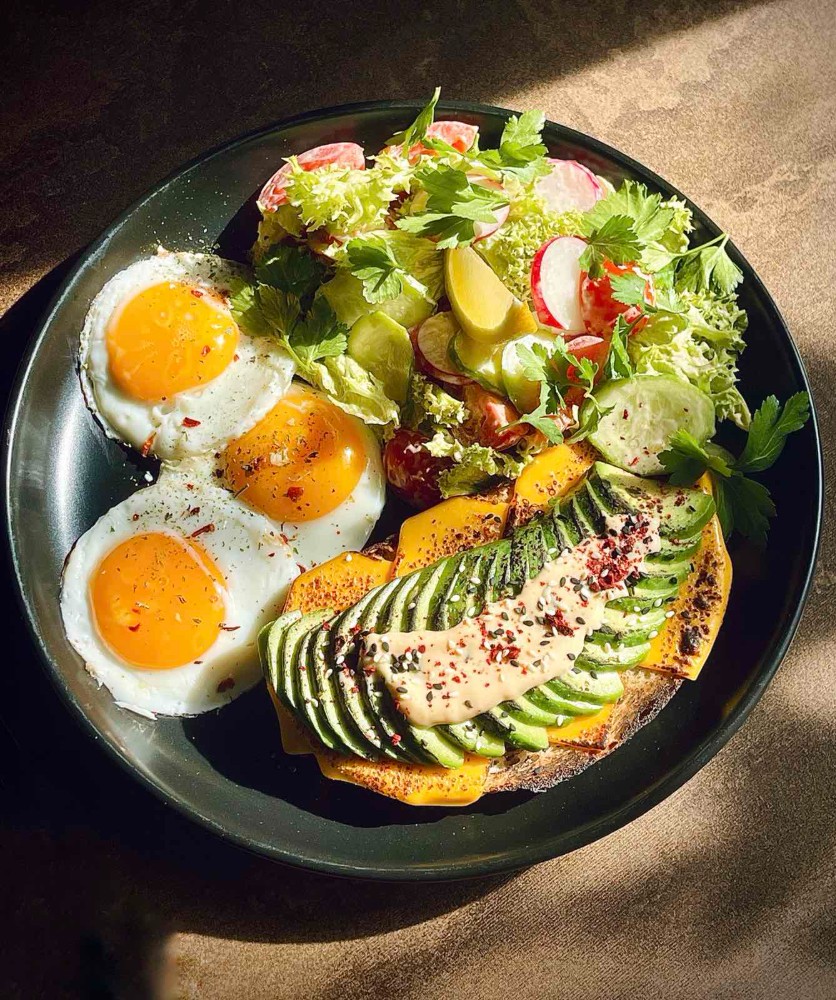 Опис: хелсі сніданок з яєчнею, свіжим весняним салатом (чері, огірок, мікс салату, редис, зелень, лимон, італійські трави) і тостом з авокадо та сиром Чедер