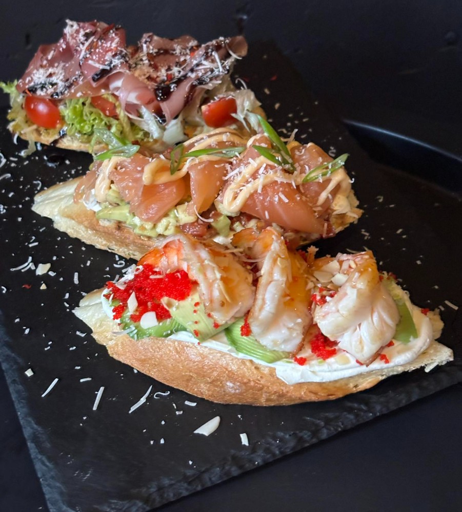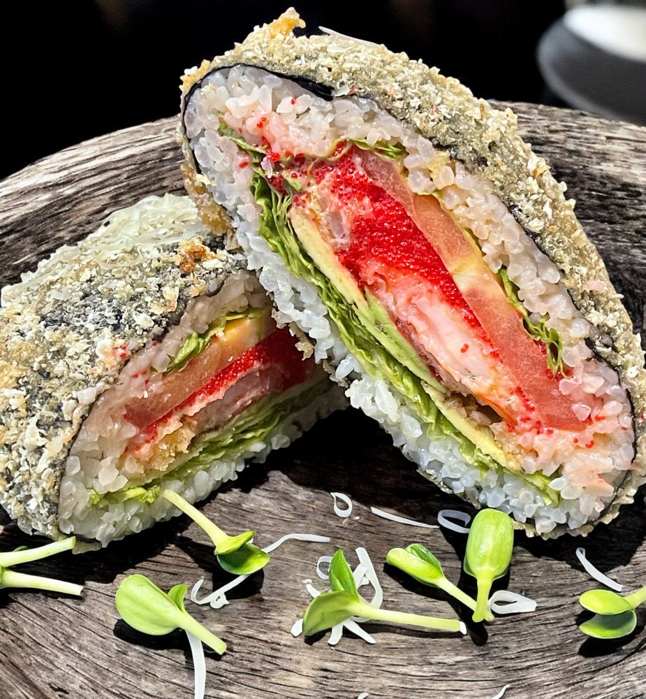 Суші-бургер з королівською креветкою в паніровці , ніжний авокадо , салат ромен , ікра масаго , фірмовий соус та томат