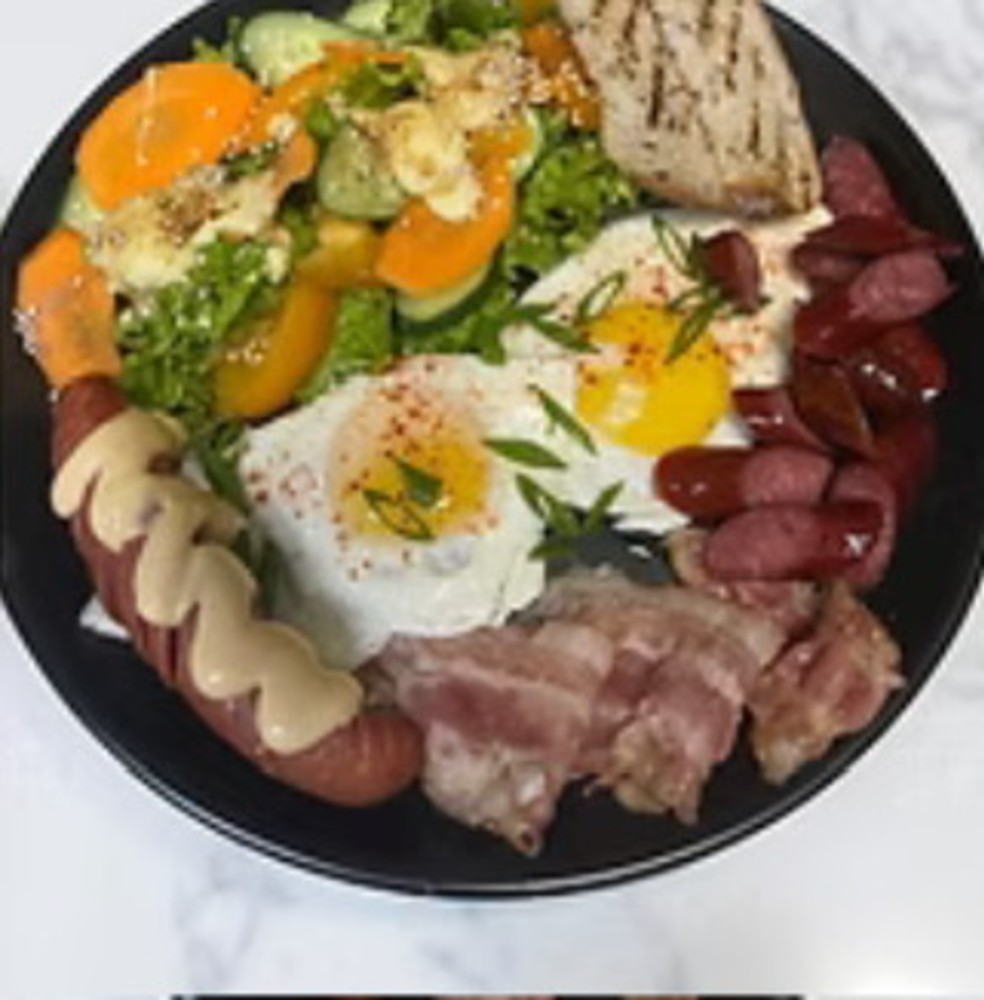 Сніданок з ковбасками та сиром халумі на грилі, окатою яєшнею, смаженим беконом , сезоним салатом та грінками