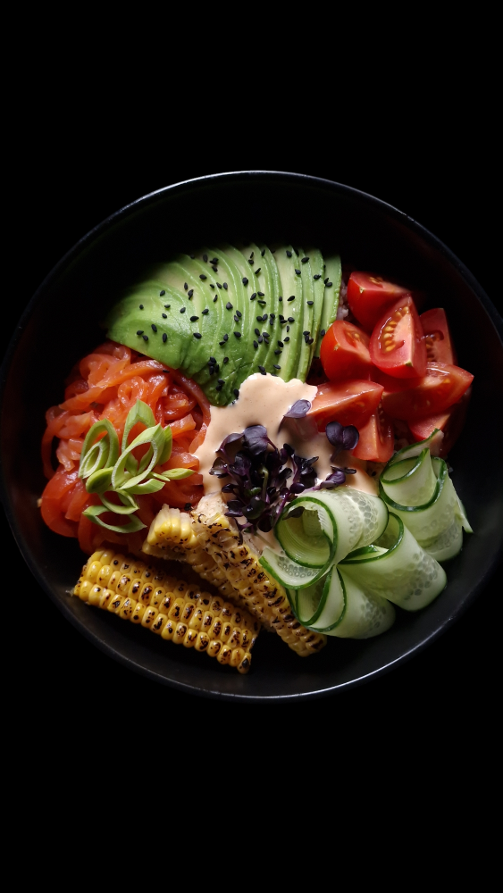 Норвезький лосось , свіжий авокадо , Огірок, рис , томати-чєрі, кукуруза-гриль, фірмовий соус та мікрогрин