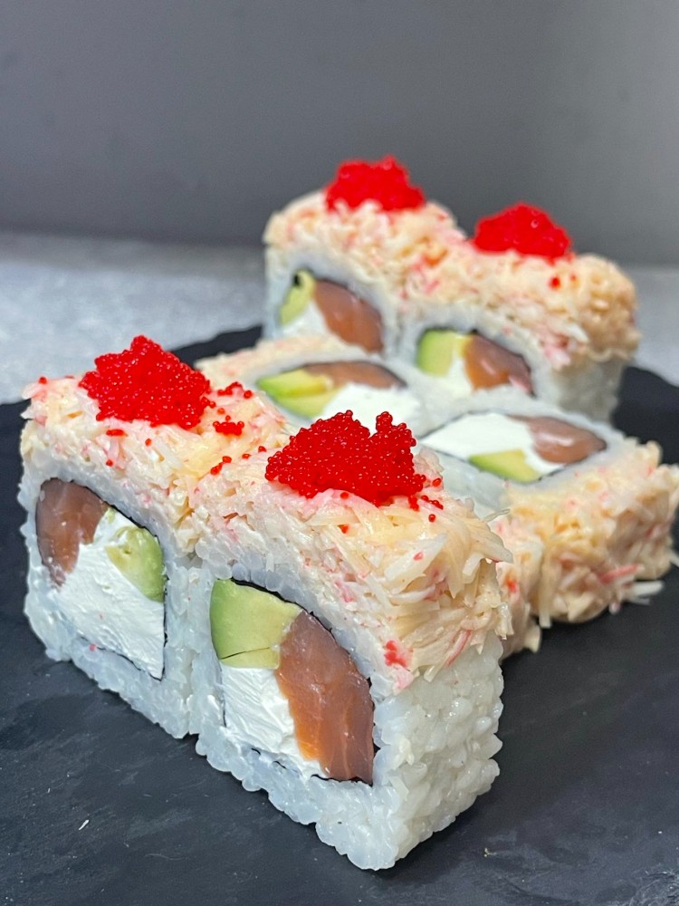 Ніжний та вишуканий рол з лососем , авокадо , чізом та з краб-мікс шапочкою