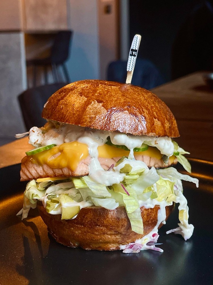 Опис: соковитий бургер з лососем гріль, солоним та свіжим огірком, сиром Чедер, фірмовим соусом Тартар і салатом Айсберг. Також додаємо трохи червоної цибулі