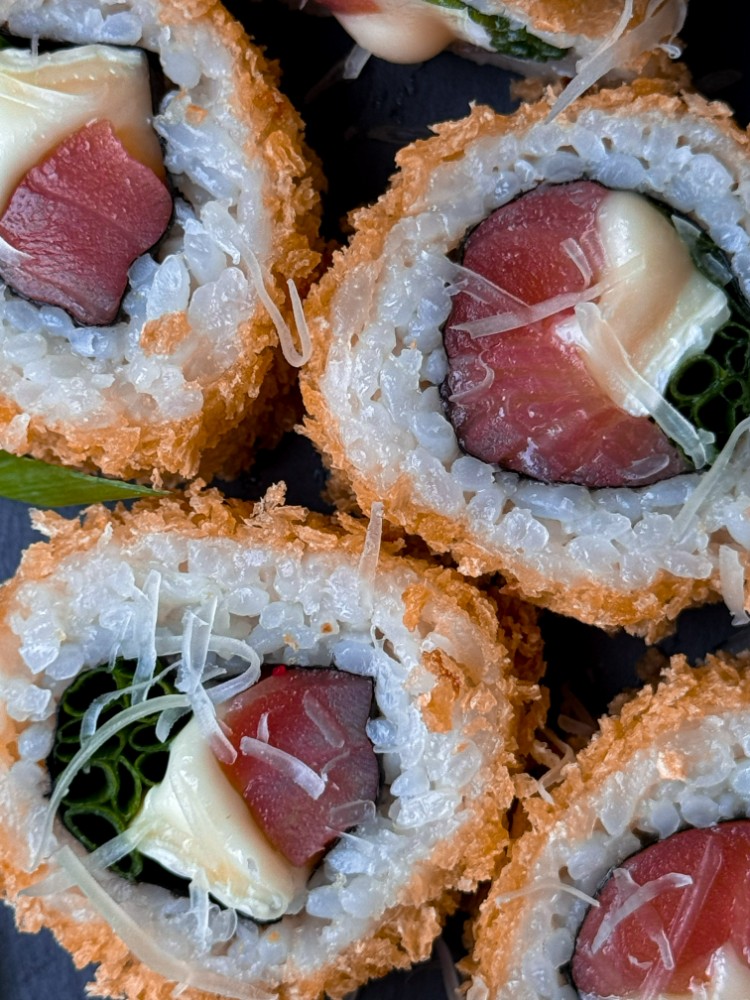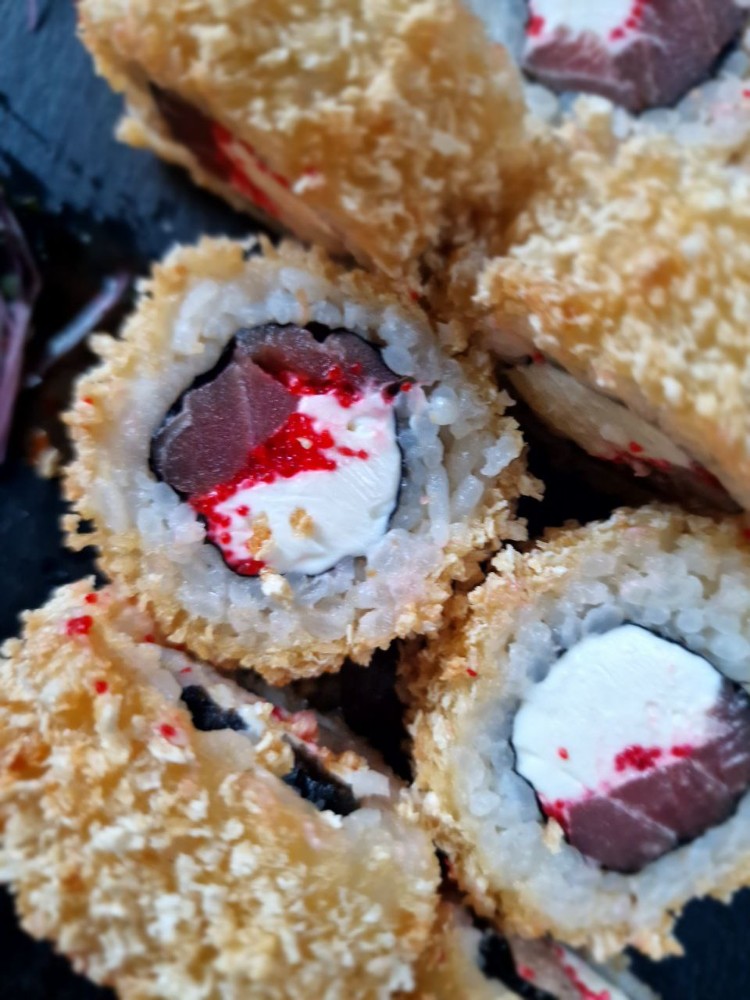Склад: Рол з атлантичним тунцем , ікрою масаго та чізом в хрусткій скоринці панко . Подається з солодким чілі-соусом