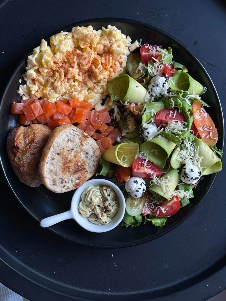 Хелсі-боул зі скрамблом , слабосолоним лососем , міксом зеленого салату та сезоними овочами , авокадо та мультизерновою булочкою на заквасці с зеленим маслом