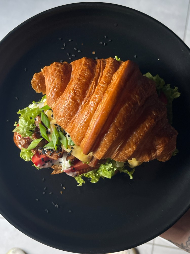 Великий Круасан зі смаженим атлантичний тунцем , зеленим салатом , помідорами , огірком, сирним міксом , кунжутним соусом та трішки зеленого лучка