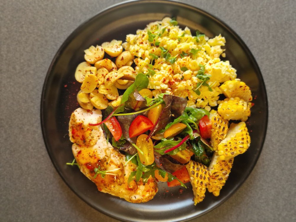 Курочка-сувід , скрамбл, кукурудза, мікс салату , помідорки чері, мариновані печериці
