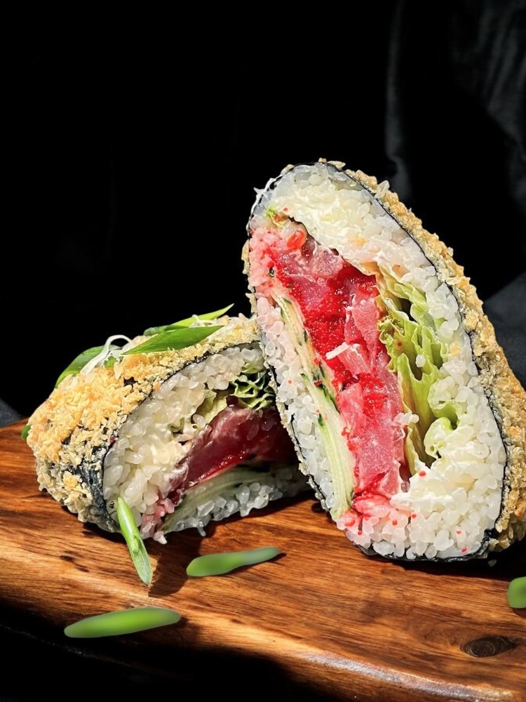 Суші-бургер в хрусткій скоринці з атлантичним тунцем, ікрою масаго, огірком, салатом ромен та пікантним соусом "Солодким Чілі"